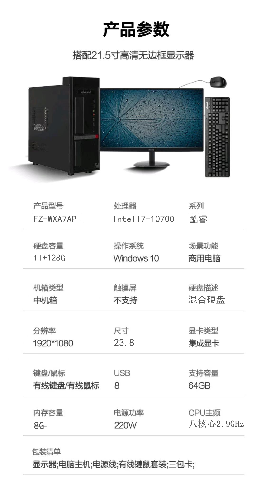 方正/eFound文祥臺(tái)式機(jī)FZ-WXA7AP英特爾酷睿i710700/8G/128SSD+1T/23.8LED 自營(yíng)