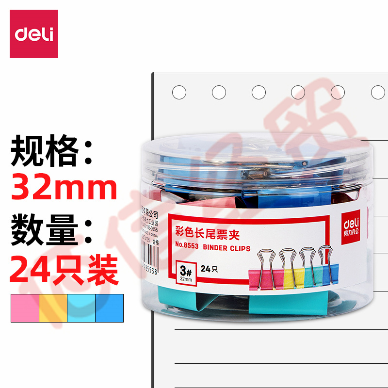 得力(deli)24只32mm彩色長尾夾票夾 3#金屬燕尾夾票據(jù)夾子 辦公用品 8553 自營