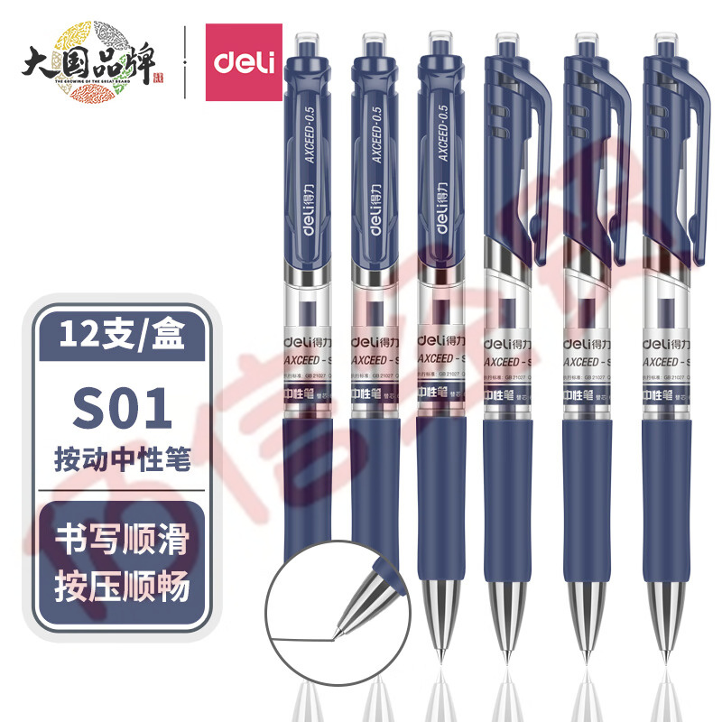 得力(deli)S01中性筆簽字筆 0.5mm子彈頭經(jīng)典辦公按動(dòng)筆水筆 墨藍(lán)12支/盒 自營