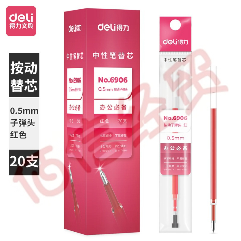得力(deli)0.5mm按動(dòng)中性筆芯 水筆簽字筆替芯 子彈頭20支/盒紅色6906 辦公用品 自營(yíng)