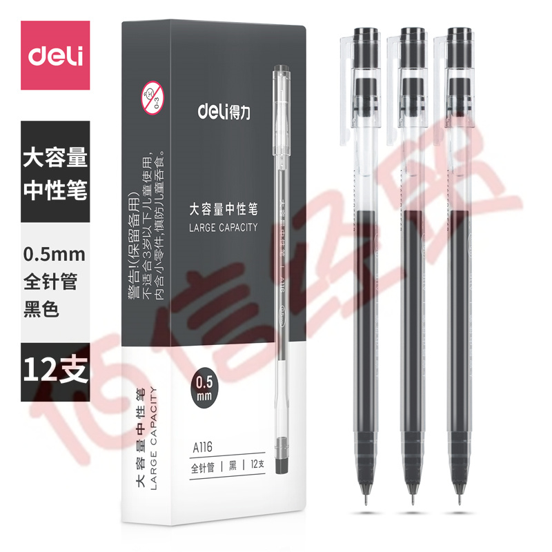 得力(deli)大容量全針管中性筆簽字筆 筆芯筆身一體化0.5mm黑色12支/盒DL-A116 學(xué)生用品 自營