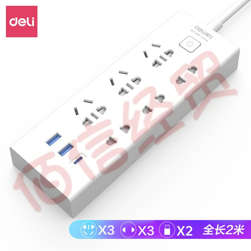 得力(deli)智能USB&Type-C插座 插排/插線板/接線板/排插/拖線板 2USB接口+1Type-C接口+6孔 總控2米 18289 自營