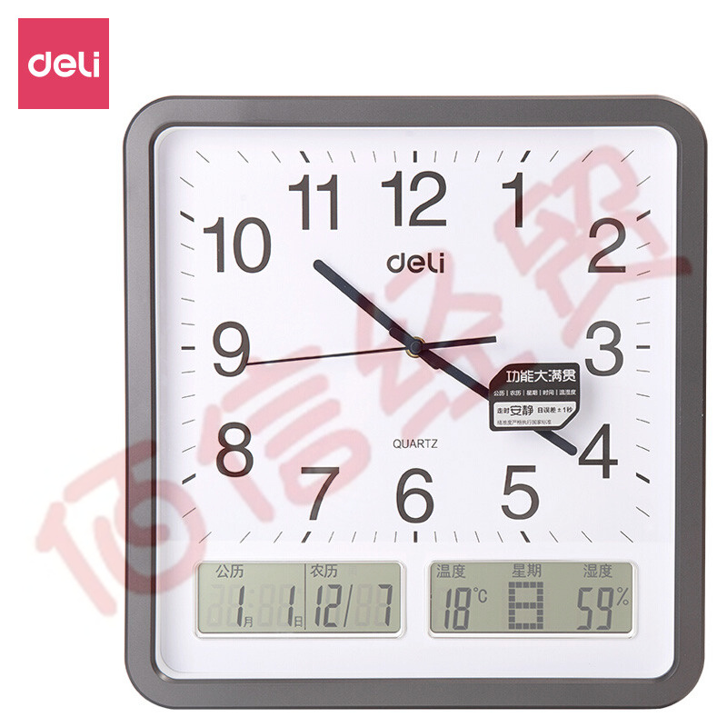 得力(deli)現(xiàn)代簡(jiǎn)約創(chuàng)意掛鐘 萬(wàn)年歷溫濕度顯示創(chuàng)意時(shí)鐘低噪音掛鐘 8823 自營(yíng)