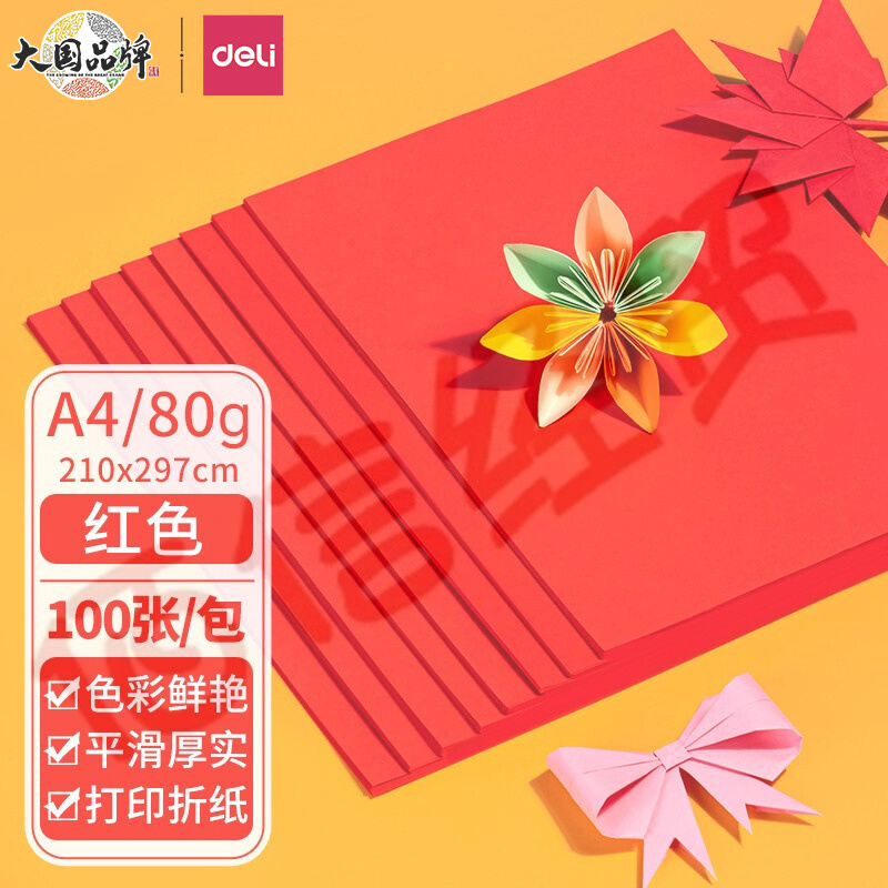 得力(deli)A4 80g大紅色復(fù)印紙 彩色打印紙 兒童手工折紙剪紙彩紙 非硬卡紙 100張/包 7758 自營