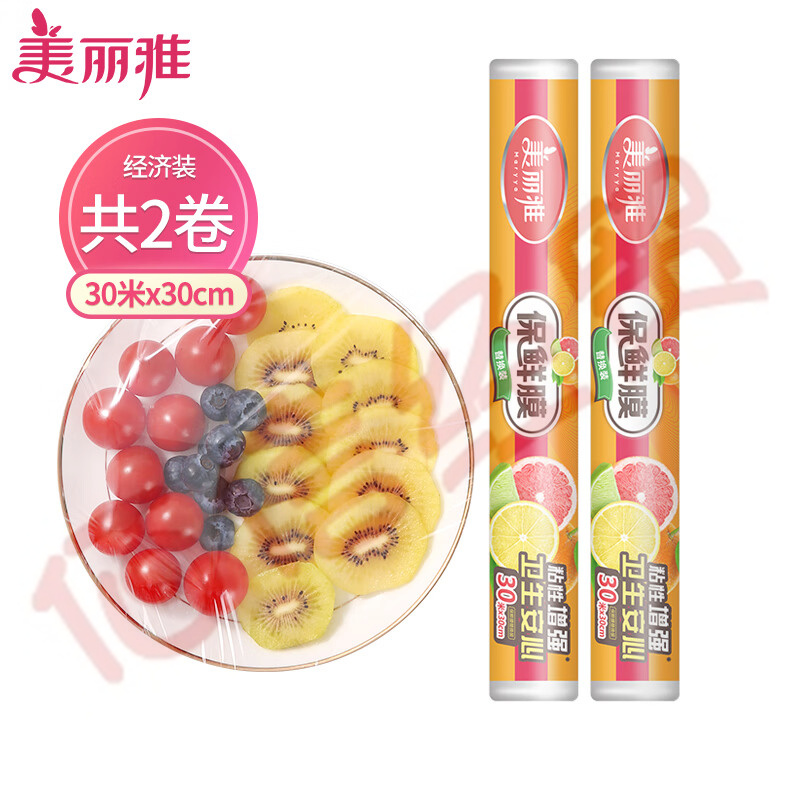¥33.80美麗雅 食品保鮮膜升級易撕取 一次性耐高溫家用大號 可蒸可微波30cm*30米2卷共60米(紙筒內(nèi)徑31mm)(24包/箱)(10個起售)
