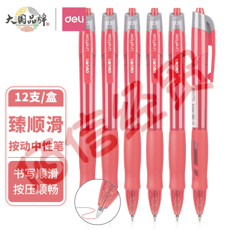 得力(deli)【順滑之星】臻順滑中性筆簽字筆 0.5mm子彈頭按動(dòng)筆水筆 辦公用品 紅色 12支/盒S08 自營