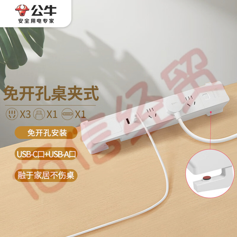 公牛(BULL)免開孔 桌夾式嵌入式插座/插線板/插排/排插/接線板/拖線板 多功能桌面插座 3位總控+2USB 自營