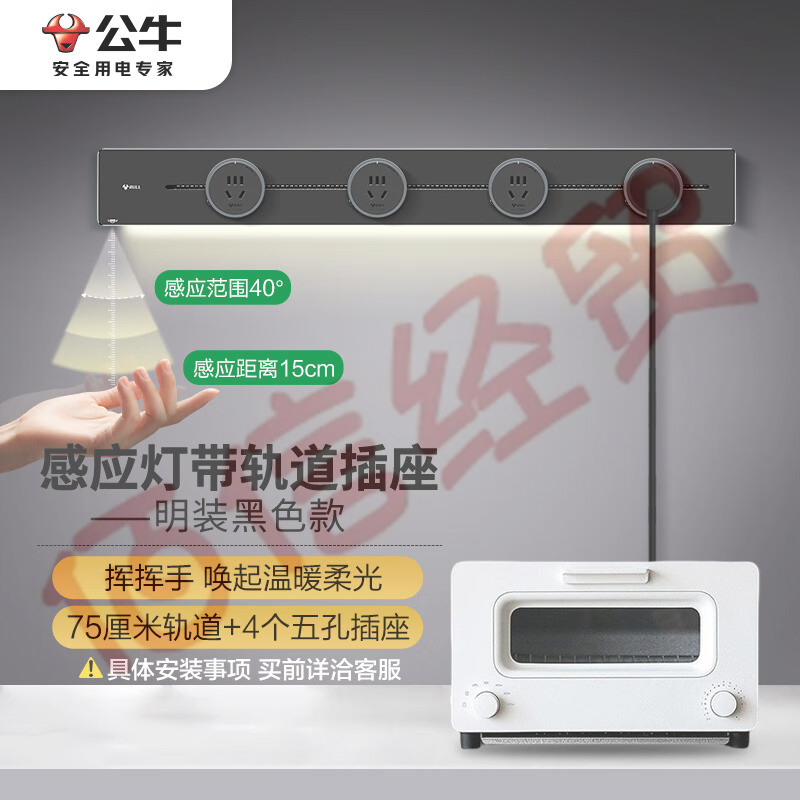 公牛(BULL)明裝 燈帶軌道插座 可移動(dòng)墻壁插座壁掛式/插線板/接線板 多功能 75厘米軌道+4個(gè)五孔插座黑色 自營(yíng)