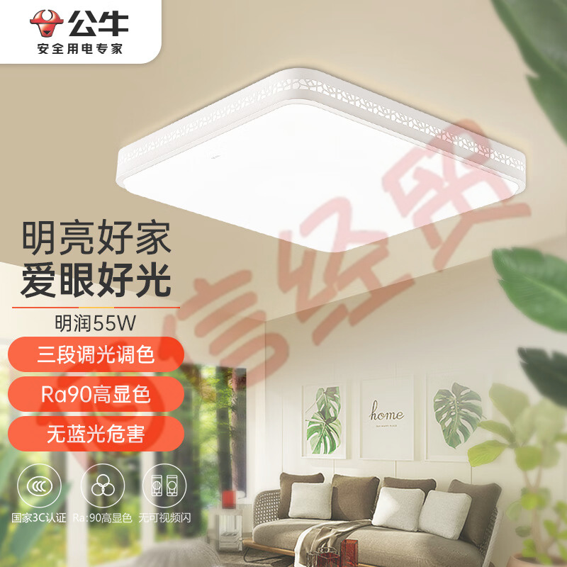 公牛(BULL)吸頂燈明潤(rùn)方形臥室燈簡(jiǎn)約現(xiàn)代三段調(diào)光調(diào)色55W 536*536*102.4mm 自營(yíng)