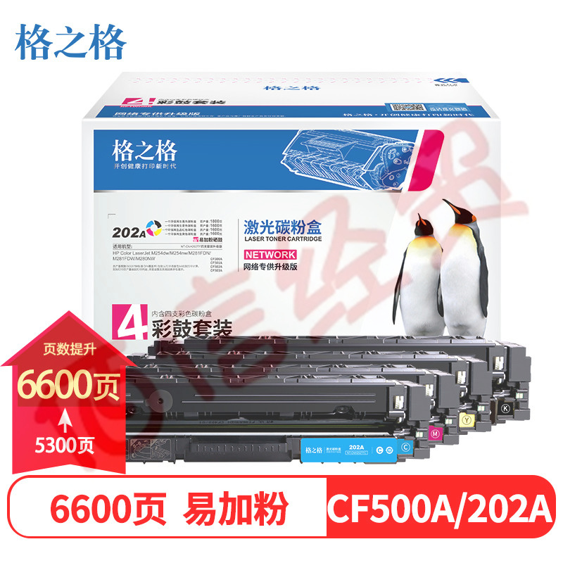 格之格 cf500a硒鼓適用惠普m281fdw硒鼓 m254dw墨盒 m254nw m281fdn m280nw 202a硒鼓 打印機(jī)易加粉四色套裝 自營