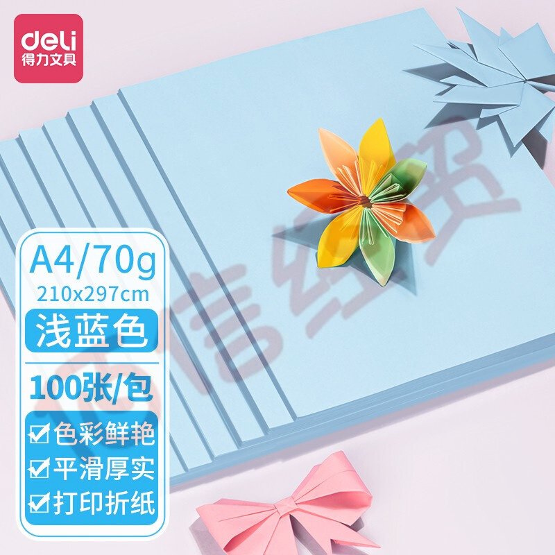 得力(deli)7391 復(fù)印紙 彩色打印紙 兒童手工折紙剪紙彩紙 非硬卡紙 A4 70g淺藍色 100張/包 自營