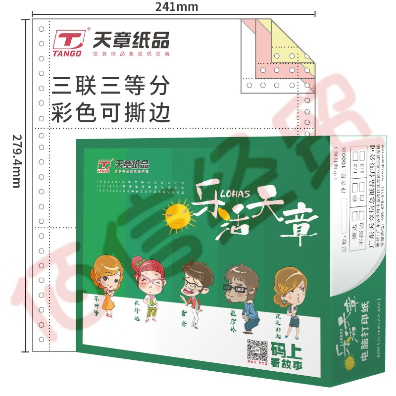 天章(TANGO)樂活天章 針式打印紙 三聯(lián)三等分撕邊電腦打印紙 彩色三聯(lián)打印紙(241-3-1/3S 白紅黃 1000頁/箱) 自營