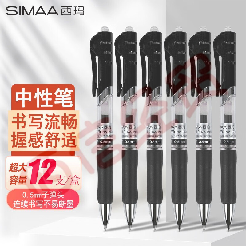 西瑪(SIMAA)中性筆黑色簽字筆水筆子彈頭0.5mm按動式筆12支/盒文具辦公用品19935 自營