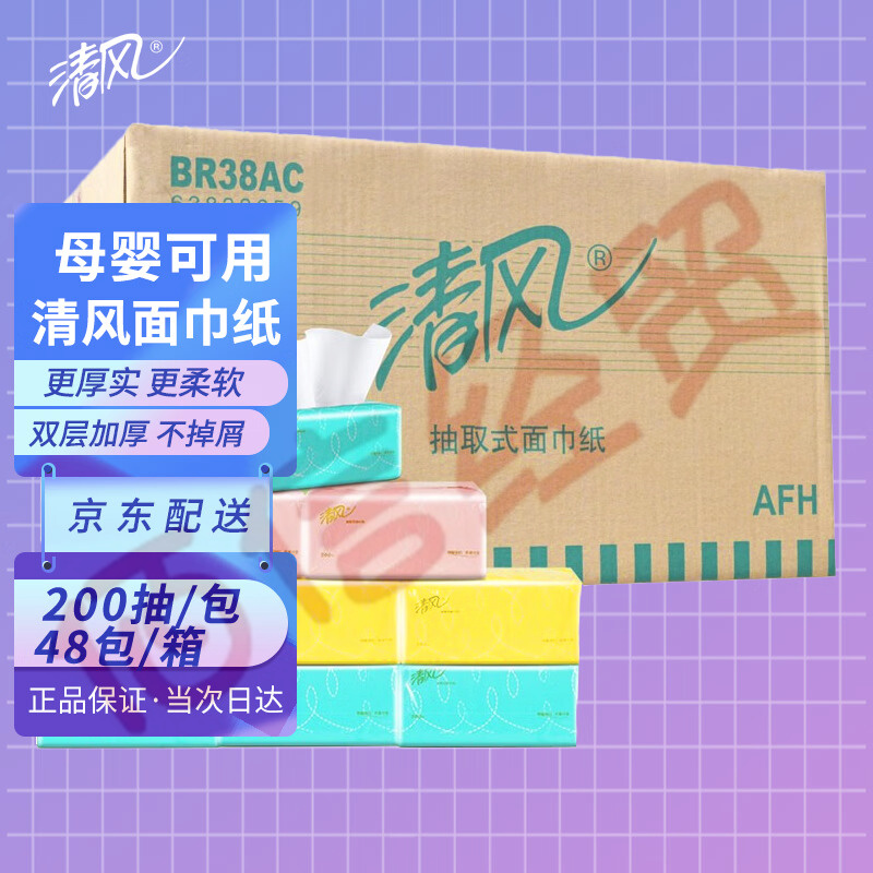 清風(fēng) 經(jīng)典抽紙三色糖果色原木小規(guī)格2層200抽家庭面巾餐巾衛(wèi)生手紙巾48包整箱BR38AC1