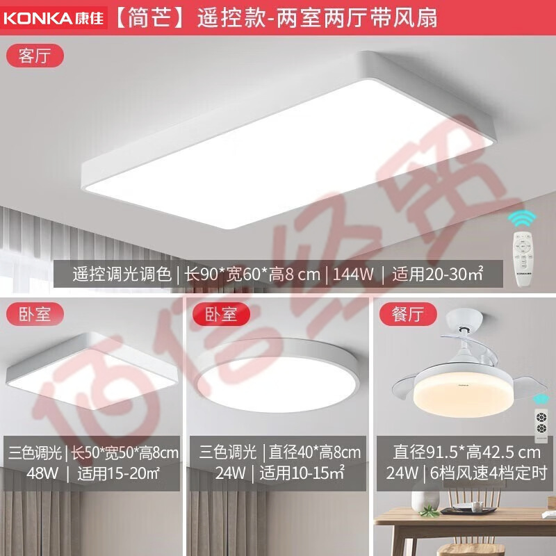 康佳(KONKA)吸頂燈簡約大氣客廳餐廳臥室燈飾全屋組合燈具套餐 【簡芒】三室一廳/帶風扇 自營