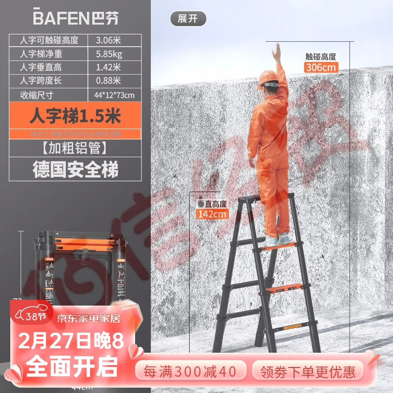 巴芬伸縮梯多功能梯子家用梯人字梯加厚鋁合金工程梯升降直梯折疊樓梯 人字梯1.5米【不帶平衡桿輪子】 自營