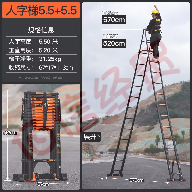 巴芬伸縮梯多功能梯子家用梯人字梯加厚鋁合金工程梯升降直梯折疊樓梯 人字梯5.5米【防滑加寬踏板】 自營