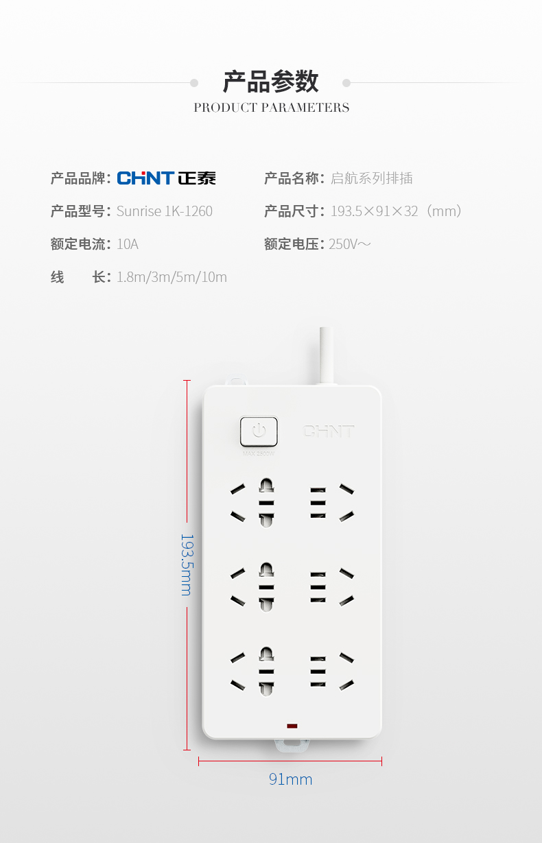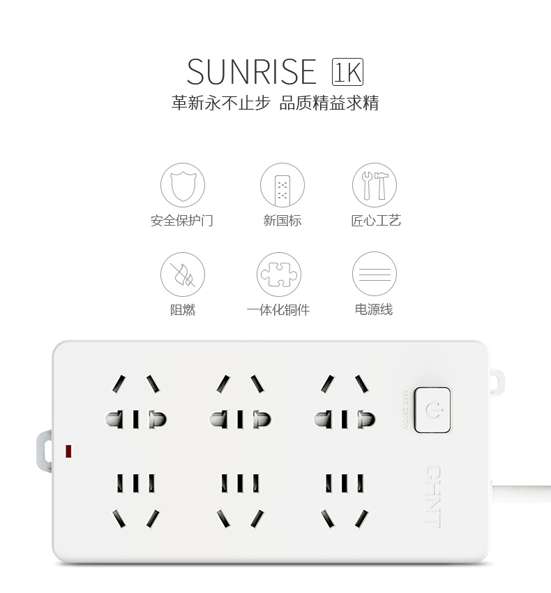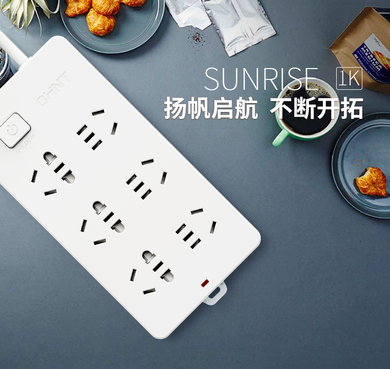 正泰插座排插拖線板插線板帶線多孔多功能家用宿舍用Sunrise1-K1260六位五孔總控(10米) 自營(yíng)