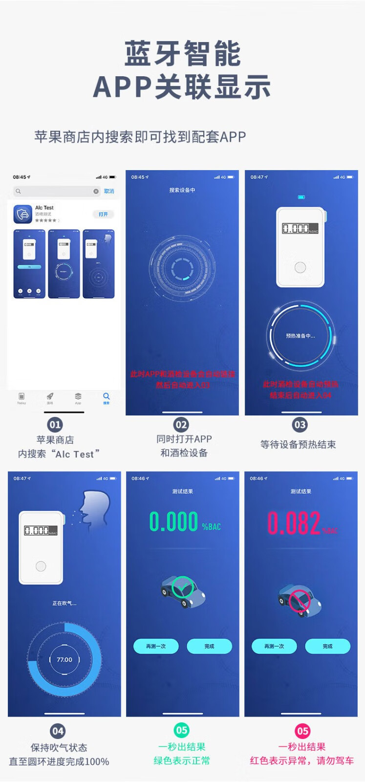 警藍(lán)偉業(yè)吹氣式查酒駕呼氣電子屏顯聲光報(bào)警藍(lán)牙版酒精檢測(cè)儀JC-800白色 自營(yíng)