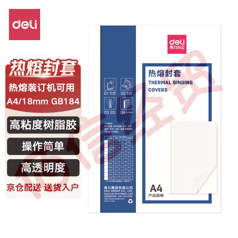 得力(deli)GB184熱熔封套熱熔裝訂機專用裝訂封皮A4/18mm(10個裝) 自營