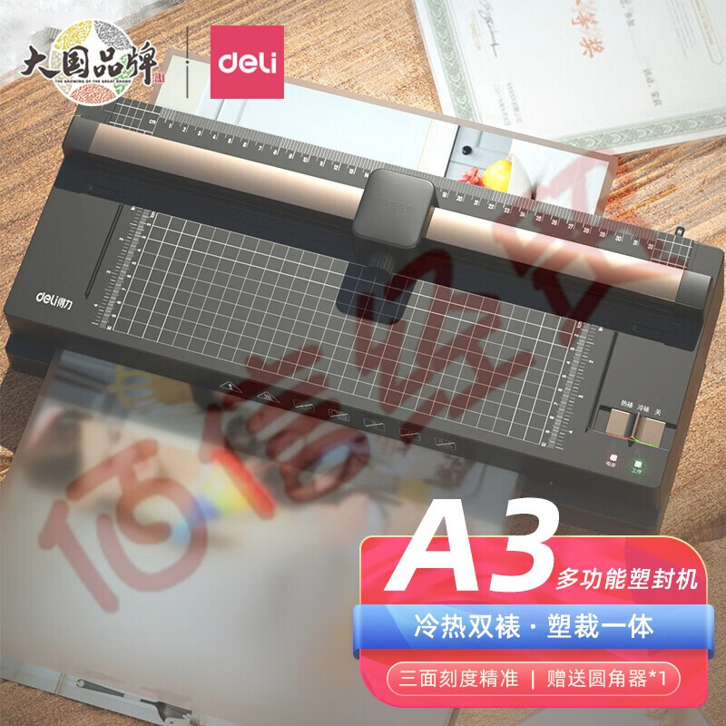 得力(deli)A4通用家用辦公塑封機(jī)帶切刀切紙裁紙過塑機(jī)含圓角器耐用覆膜機(jī)封塑機(jī)壓膜照片塑封機(jī)A3塑裁一體冷熱雙裱14377 自營