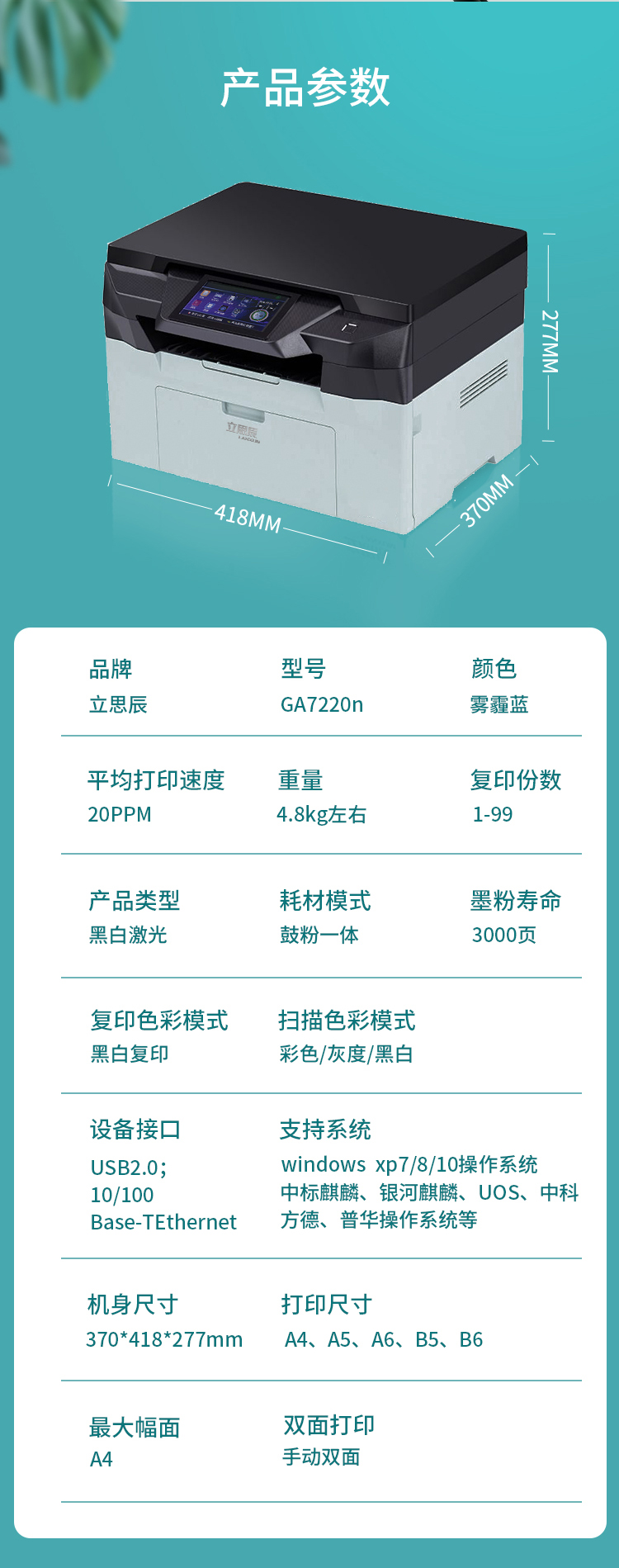 立思辰(LANXUM)A4黑白多功能一體機(jī)GA7220n、打印/掃描/復(fù)印、網(wǎng)絡(luò)打印 自營